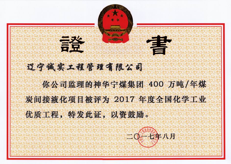 2017年全國(guó)化學(xué)工業(yè)優(yōu)質(zhì)工程(神華寧煤集團(tuán)400萬噸/年煤炭間接液化項(xiàng)目)