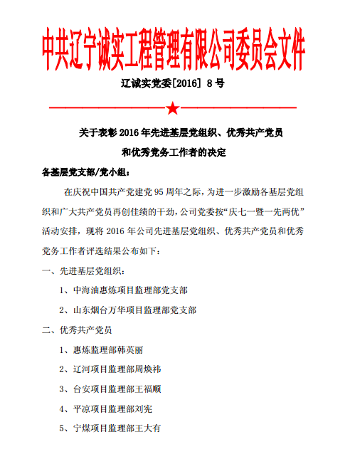 7月1日下午,公司黨委召開《慶祝建黨95周年暨“一優(yōu)兩先”表彰視頻大會》。主會場設在公司一樓會議室,中海油惠州項目監(jiān)理部黨支部、甘肅華亭項目監(jiān)理部黨支部、神華寧煤項目監(jiān)理部黨支部、煙臺萬華項目監(jiān)理部黨支部設立視頻分會場。黨委副書記馮玉琢主持了視頻大會。首先為新黨員中海油惠州項目監(jiān)理部黨支部的李婷婷舉行了入黨宣誓儀式,公司黨委委員劉興善同志宣讀了公司黨委對戰(zhàn)勝、吳琪轉(zhuǎn)為中共正式黨員的批復。公司黨委委員馬俊同志宣讀了“一優(yōu)兩先”表彰決定。黨委書記孫學良結(jié)合公司實際做了慶祝建黨95周年的講話。最后全體黨員重溫的入黨誓詞,進行入黨宣誓。