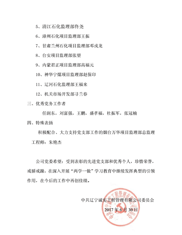 為慶祝中國共產(chǎn)黨建黨96周年,公司黨委于2017年6月30日下午在公司一樓會議室召開了慶祝建黨96周年暨“一優(yōu)兩先”表彰視頻大會。公司機關(guān)、撫順各項目監(jiān)理部及在撫的黨員同志在主會場參加了大會,中海油惠州項目監(jiān)理部黨支部、甘肅華亭項目監(jiān)理部黨支部、寧夏石化項目監(jiān)理部黨支部、中化泉州項目監(jiān)理部黨支部、廣西石化項目監(jiān)理部黨支部、蘭州石化項目監(jiān)理部黨支部、內(nèi)蒙古君正項目監(jiān)理部黨支部、神華寧煤項目監(jiān)理部黨支部、煙臺萬華項目監(jiān)理部黨支部設立視頻分會場。黨委委員馬駿主持了視頻大會。首先,公司黨委副書記馮玉琢同志宣讀了“一優(yōu)兩先”表彰決定。接著,黨委書記孫學良結(jié)合公司實際做了慶祝建黨96周年的講話。最后全體黨員重溫的入黨誓詞,進行入黨宣誓。