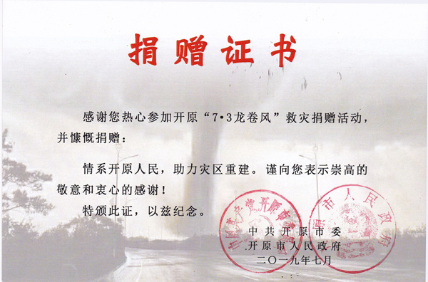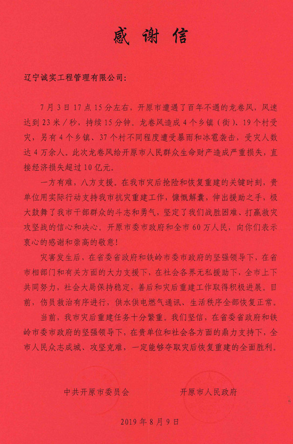 2019年7月3日一場可怕的龍卷風(fēng)席卷了遼寧省開原市,據(jù)初步統(tǒng)計,這場災(zāi)害共造成6人死亡、190余人受傷、2.8萬人受災(zāi),房屋受損6451戶,農(nóng)業(yè)大棚受損25棟,農(nóng)田受災(zāi)14.6萬畝,100余萬平方米廠房遭受嚴(yán)重?fù)p壞,造成直接經(jīng)濟損失約10.75萬元。災(zāi)情發(fā)生后,省委、省政府及省住建廳領(lǐng)導(dǎo)高度重視,號召全省監(jiān)理企業(yè)為此次災(zāi)情捐款。龍卷風(fēng)無情,人有情。為了幫助受災(zāi)同胞共渡難關(guān),我單位積極響應(yīng)省委、省政府、省建設(shè)廳以及省協(xié)會的號召,在第一時間捐款3000元。參與此次捐款的省監(jiān)理單位共計近30家,捐款數(shù)額從500元至20000元不等。事后,開原市委、開原市政府為我單位頒發(fā)了感謝信以及捐贈證書。