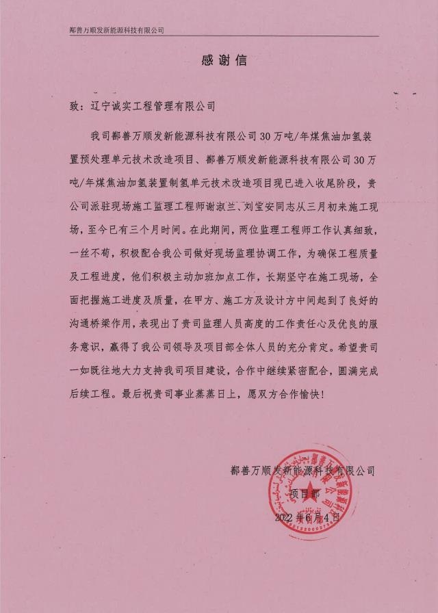 6月6日,公司新疆鄯善項(xiàng)目部收到業(yè)主單位的表?yè)P(yáng)信。信中,業(yè)主言真意切地對(duì)我公司監(jiān)理人員在項(xiàng)目開(kāi)展期間勤勉盡責(zé)的工作精神給予了高度的贊譽(yù)和充分的認(rèn)可。業(yè)主的表?yè)P(yáng)是對(duì)公司綜合實(shí)力、服務(wù)質(zhì)量、技術(shù)水平的又一次肯定,誠(chéng)實(shí)人必將以此為動(dòng)力,在嚴(yán)守安全底線、嚴(yán)把工程質(zhì)量大關(guān)的道路上砥礪前行!