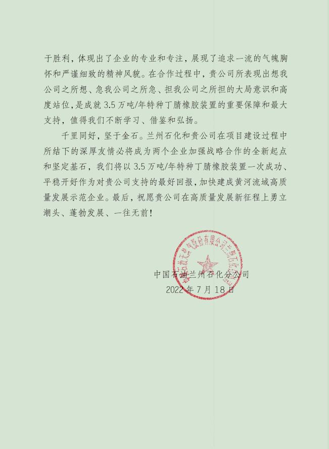 近日,由我公司監(jiān)理的中國(guó)石油天然氣股份有限公司蘭州石化分公司--3.5萬(wàn)砘/年特種丁腈橡膠項(xiàng)目喜獲業(yè)主表?yè)P(yáng)信。表?yè)P(yáng)信充分肯定了誠(chéng)實(shí)監(jiān)理的工作成果,對(duì)駐蘭州項(xiàng)目部全體監(jiān)理工程師在項(xiàng)目建設(shè)過(guò)程中所付出的努力表示由衷的感謝。