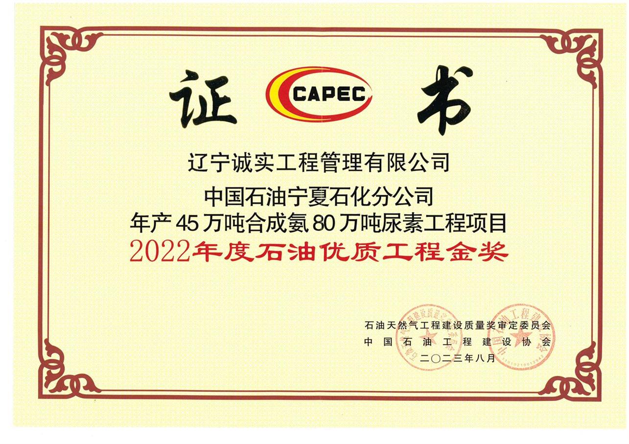 祝賀遼寧誠(chéng)實(shí)參建的“中國(guó)石油寧夏石化分公司年產(chǎn)45萬(wàn)噸合成氨80萬(wàn)噸尿素工程項(xiàng)目”榮獲2022年度石油優(yōu)質(zhì)工程金獎(jiǎng)!這是一份遲到的榮譽(yù),但是卻未曾缺席。