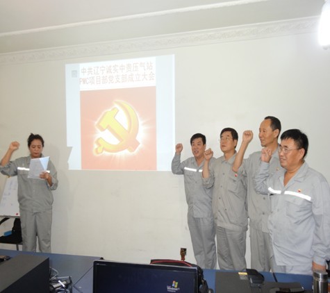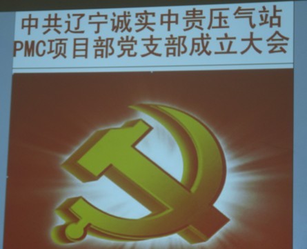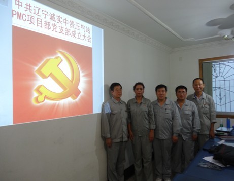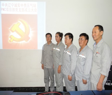 2013年7月21日遼寧誠(chéng)實(shí)中貴線(xiàn)壓氣站PMC項(xiàng)目部黨支部成立大會(huì)正式召開(kāi),大會(huì)由公司黨委委員趙樹(shù)環(huán)同志主持,首先介紹了了黨支部成立的意義和目的,然后進(jìn)入了大會(huì)流程。通過(guò)全體黨員民主評(píng)議、選舉,盛孝福同志當(dāng)選為PMC項(xiàng)目部黨支部書(shū)記,師興華同志當(dāng)選為黨支部組織委員,胡德林同志當(dāng)選為黨支部宣傳委員,趙樹(shù)環(huán)同志代表公司黨委對(duì)黨支部成立表式祝賀。黨支部全體黨員在黨旗下進(jìn)行了鄭重宣誓,最后由黨支部書(shū)記作表態(tài)發(fā)言。
