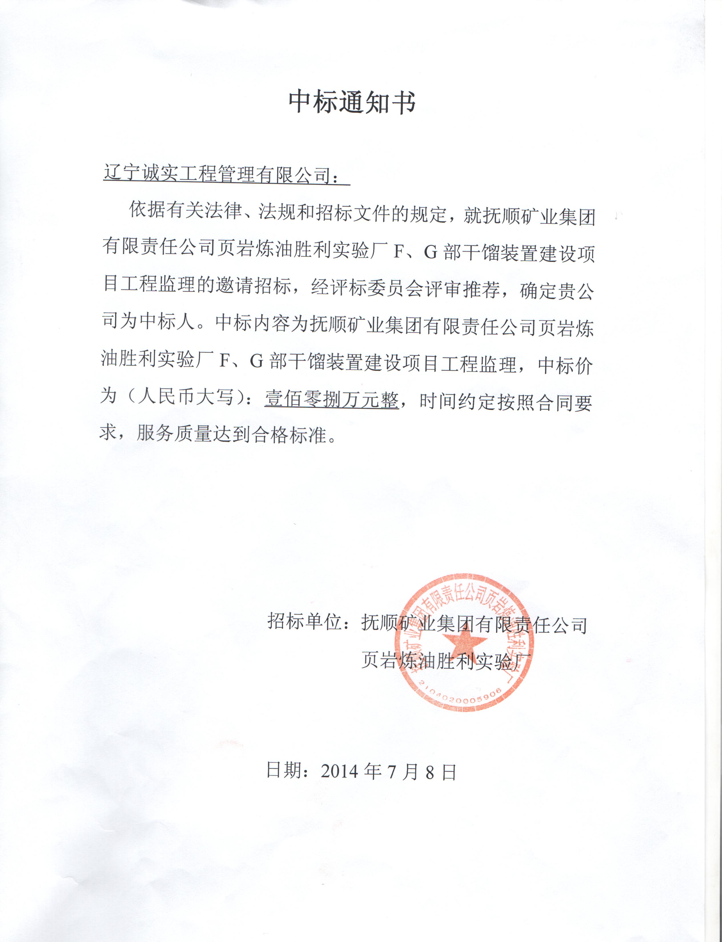 我公司成功中標(biāo)撫順礦業(yè)集團(tuán)有限責(zé)任公司頁巖煉油勝利實(shí)驗(yàn)廠F、G部干餾裝置建設(shè)項(xiàng)目工程監(jiān)理項(xiàng)目